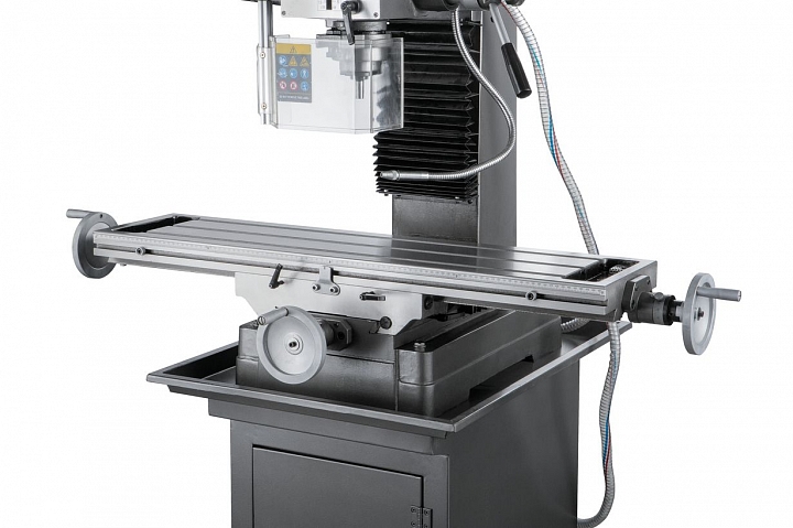 Фрезерно-сверлильный станок этой модели имеет конструкцию, рассчитанную на выполнение большого объема работы по обработке заготовок. Станок оснащен шпинделем с конусом ISO30 с зажимной тягой М12. Ход пиноли шпинделя составляет 120 мм. Станок обеспечивает нормальную работу с режущими инструментами, максимальный диаметр которых составляет при сверлении стали до 32 мм и чугуна до диаметра 45мм, при фрезеровании концевой фрезой до 32мм и торцевой фрезой до 80 мм. Оборудование позволяет осуществлять вращение шпинделя в обоих направлениях, вправо и влево. Наличие микрометрической подачи, позволяет установить инструмент на необходимую глубину в ручном режиме. Максимальный вылет пиноли шпинделя составляет 120 мм.